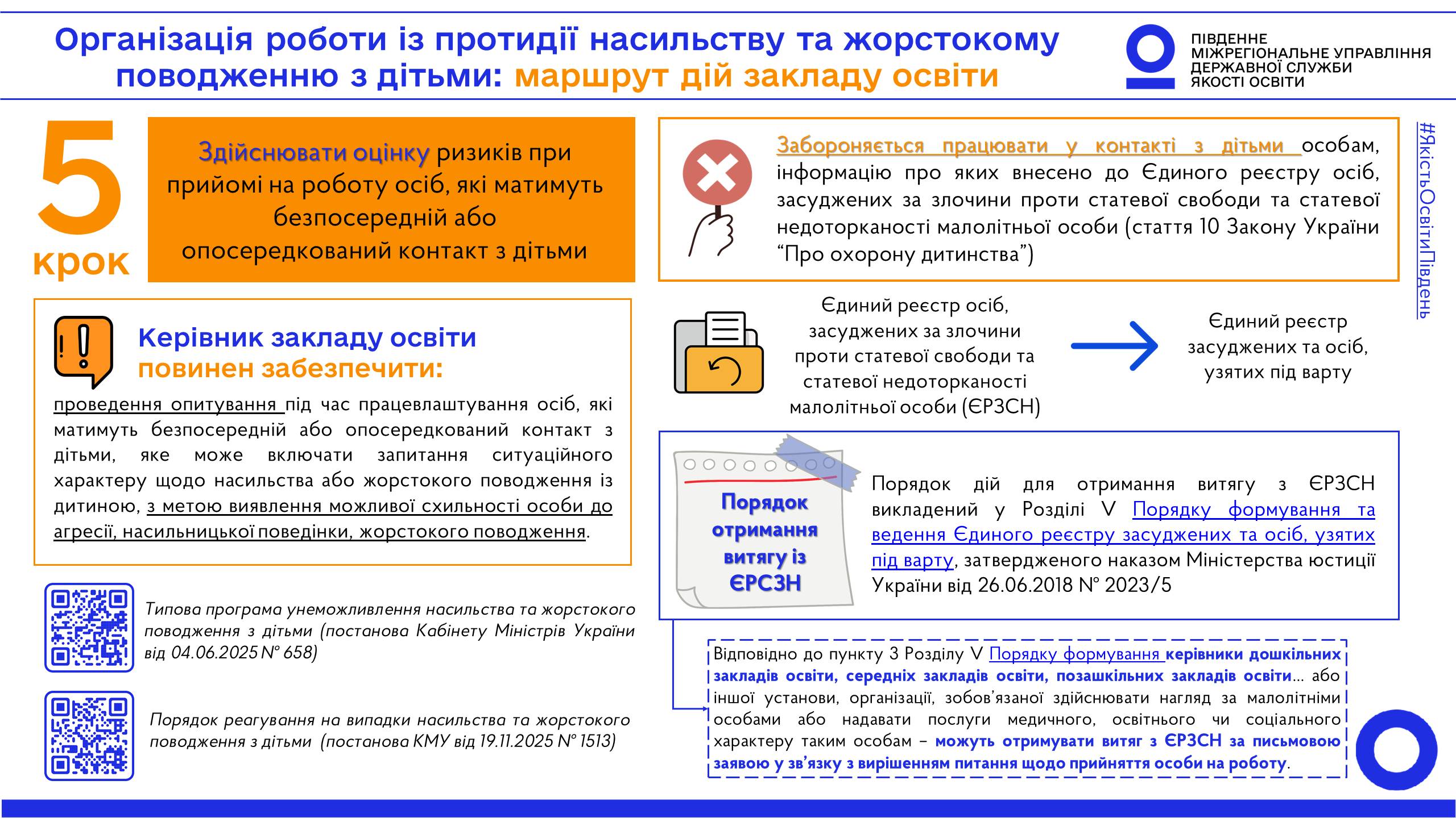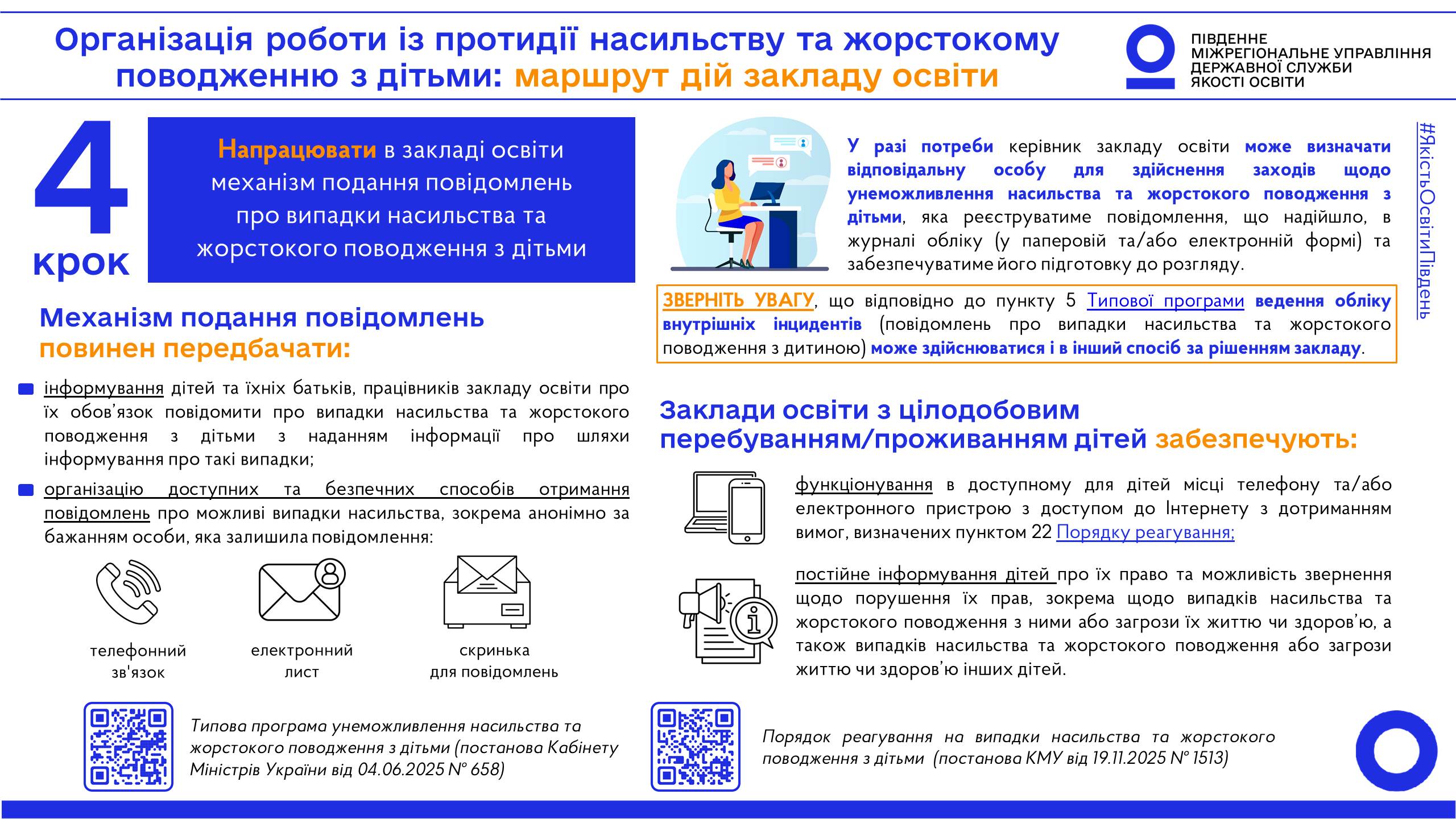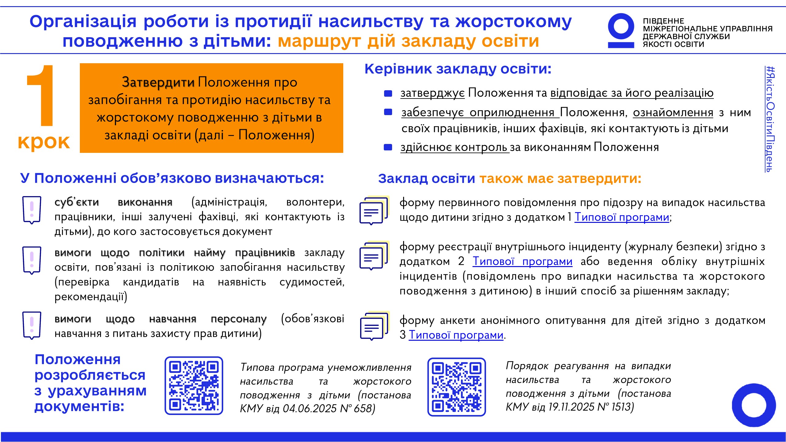Спираючись на зазначені документи, команда Південного міжрегіонального управління Державної служби якості підготувала та пропонує до уваги закладів освіти серію матеріалів щодо маршруту дій для належної організації роботи із протидії насильству та жорстокому поводженню з дітьми.