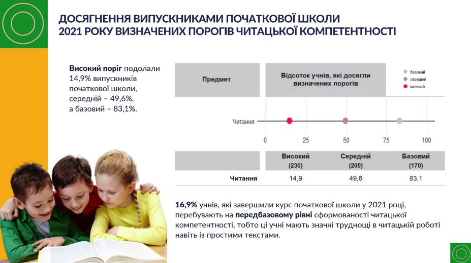 • За роботи з інформаційним текстом, випускник(ця) початкової школи засвідчує здатність знаходити фактичну, конкретну інформацію, наведену в різних форматах, зокрема на картах, у таблицях, основні важливі деталі в описах об’єктів, у переліках, робити прості висновки про причиново-наслідкові зв’язки, послідовність дій, визначати основні риси подібності й відмінності предметів, оцінювати корисність, достовірність інформації, якщо тематика тексту добре знайома.